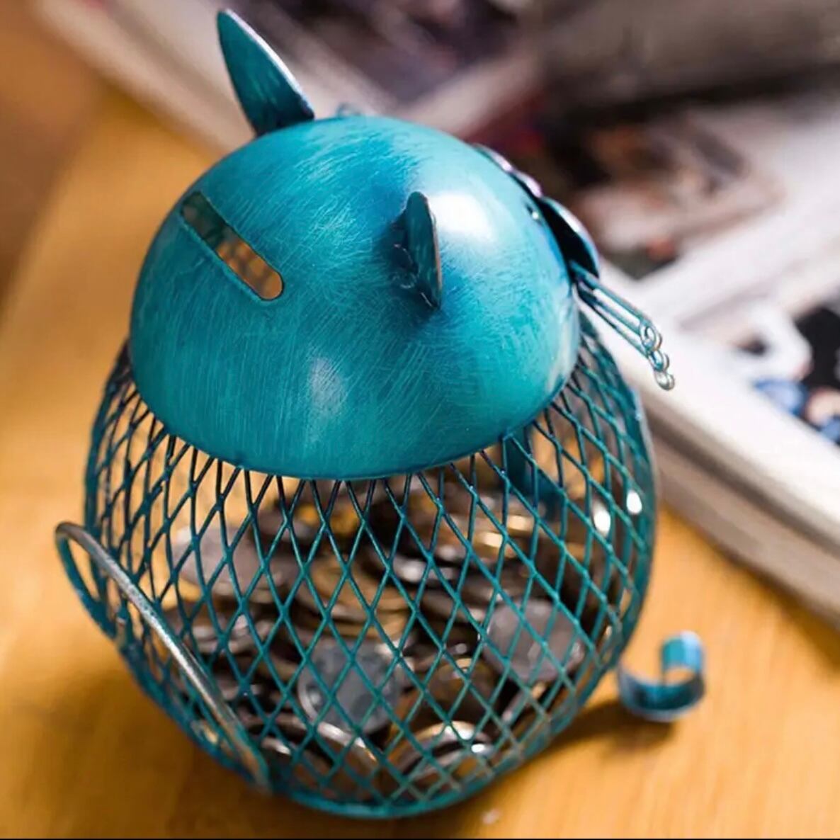 まんまるフォルムにちょこんと猫耳がついた、ユニークなワイヤーメッシュの猫型貯金箱。